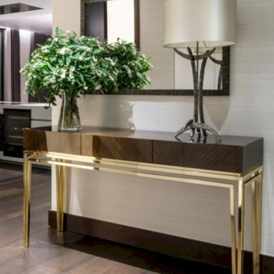Introducing D’LUJO’s The Manhattan Console Table, a stunning piece that redefines modern elegance with a touch of timeless design. The tabletop is a testament to masterful craftsmanship, featuring a high-quality wood finished with a rich, glossy lacquer and a beautifully executed chevron or herringbone pattern. This rich, textured top is perfectly balanced by a sleek, minimalist frame forged from polished brass or gold-finished steel. The clean lines and open design of the frame add a sense of lightness and architectural grace. The Manhattan is as functional as it is beautiful, with spacious drawers providing discreet storage for essentials. This piece is an ideal addition to a grand entryway, a spacious hallway, or as a sophisticated display table behind a sofa, where it will add an unparalleled layer of curated style and refinement, embodying the very essence of the D’LUJO brand.