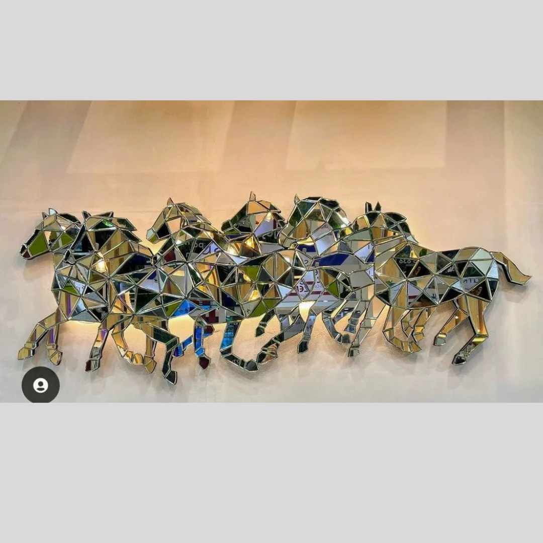 D’LUJO presents The Pegasus, a stunning mirrored wall sculpture. This dynamic art piece captures the powerful elegance of galloping horses, with its faceted design reflecting and amplifying light. A perfect statement of artistic luxury and motion for a grand interior.