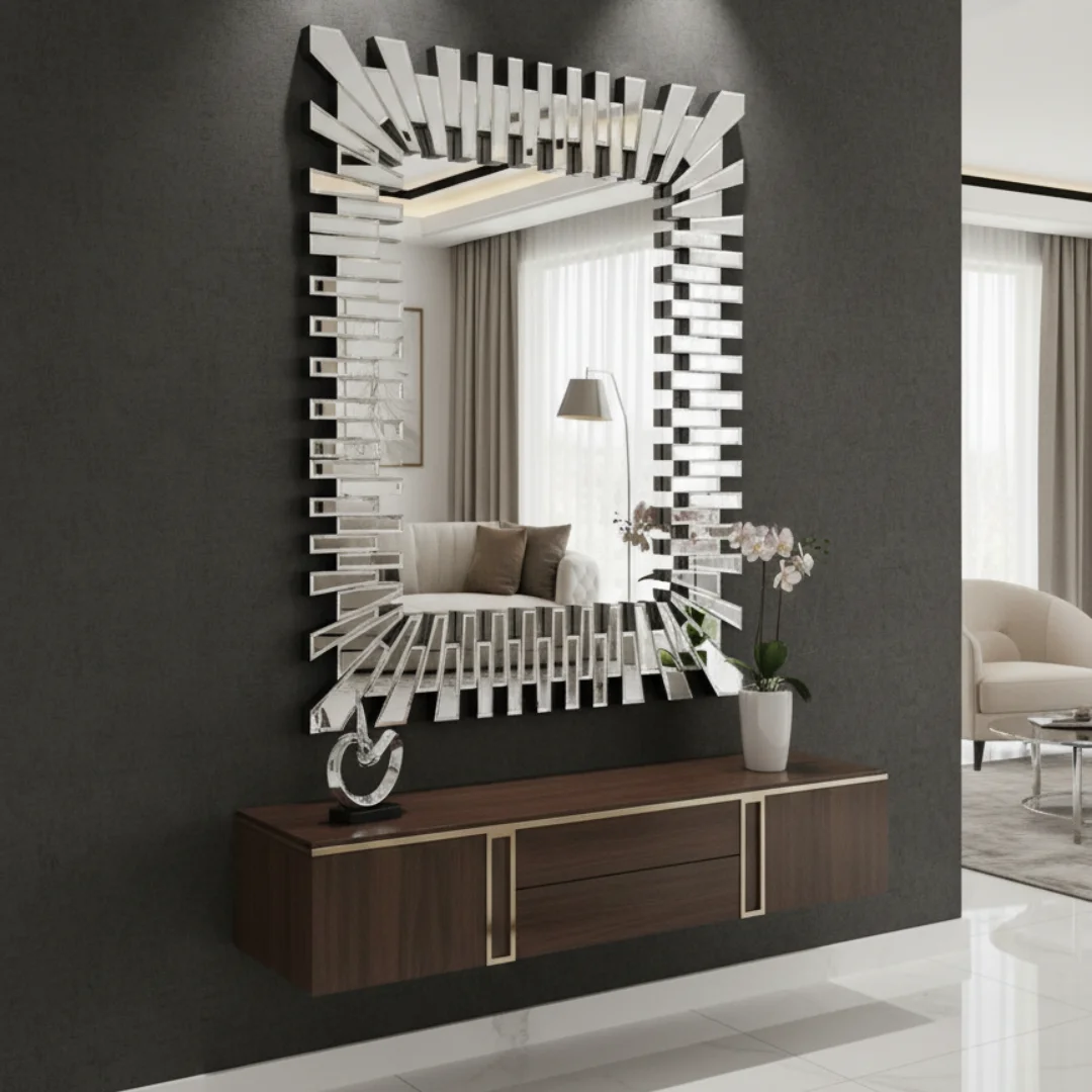 Introducing D’LUJO’s The Solstice Mirror, a stunning piece that redefines decorative art with a bold, architectural twist. The central mirror is crafted from high-quality, non-beveled glass, offering a clear and flawless reflection. What truly sets this piece apart is its magnificent frame, composed of a series of meticulously hand-cut and beveled mirrored panels. These rectangular shapes are expertly arranged in a dynamic, radiating pattern that refracts and amplifies the light in the room, creating a brilliant, energetic effect. The flawless craftsmanship and commanding design make this mirror a commanding focal point, perfect for a modern living room, a minimalist entryway, or a high-end commercial space. The Solstice is more than just a functional item; it’s a beautiful work of art that infuses any interior with a sense of sophisticated, avant-garde elegance, embodying the essence of the D’LUJO brand.